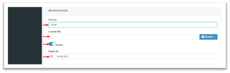 The lowest block of the client's settings must be filled with data on the current alcohol license: