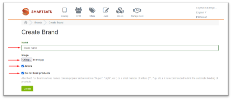 To create a new brand, you need to log in under the catalog administrator account and go to the Management section>Brands.