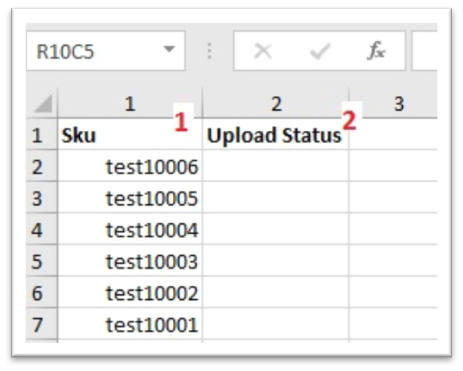 The imported xls file must contain in the first column barcodes of the target products - Product SKU. The second column is used for the system to set the record processing status - Upload Status.