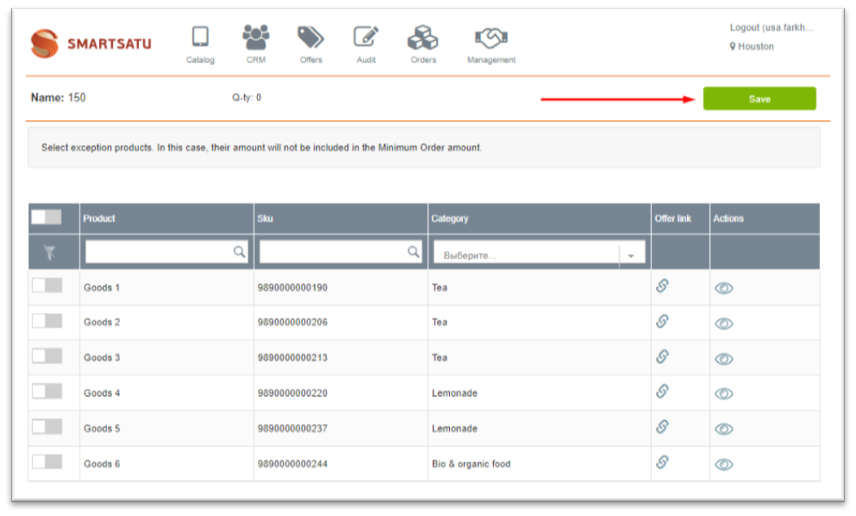 The selection of exception products is not mandatory. If the user clicked the Save button at this step without selecting any product, the system considers that the Minimum order amount includes in the check the sum of all products in the cart for the selected Retailers.