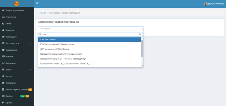 При сортировке у поставщика есть возможность сортировать предложения по выбранным категориям с помощью функции drag'n'drop (перетаскивание). Для того чтобы задать сортировку на первом шаге необходимо ввести название поставщика, для предложений которого будет применена сортировка.