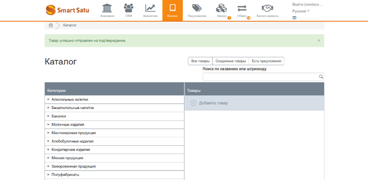 Для того чтобы создать новый товар, необходимо под учетной записью администратора каталога или поставщика перейти в раздел Предложения. Далее нажав на иконку + Добавить товар приступить к созданию товара