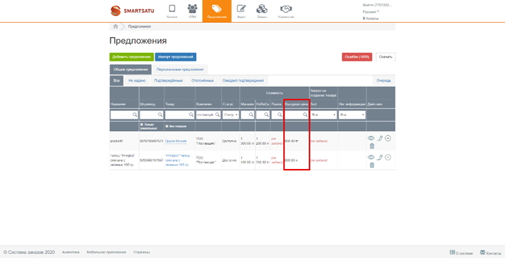 При импорте предложений в систему Smart Satu необходимо указать первоначальную цену Price 1 (для магазина), Price 2 (для ХоРеКа) и конечную промо-цену Price 5.