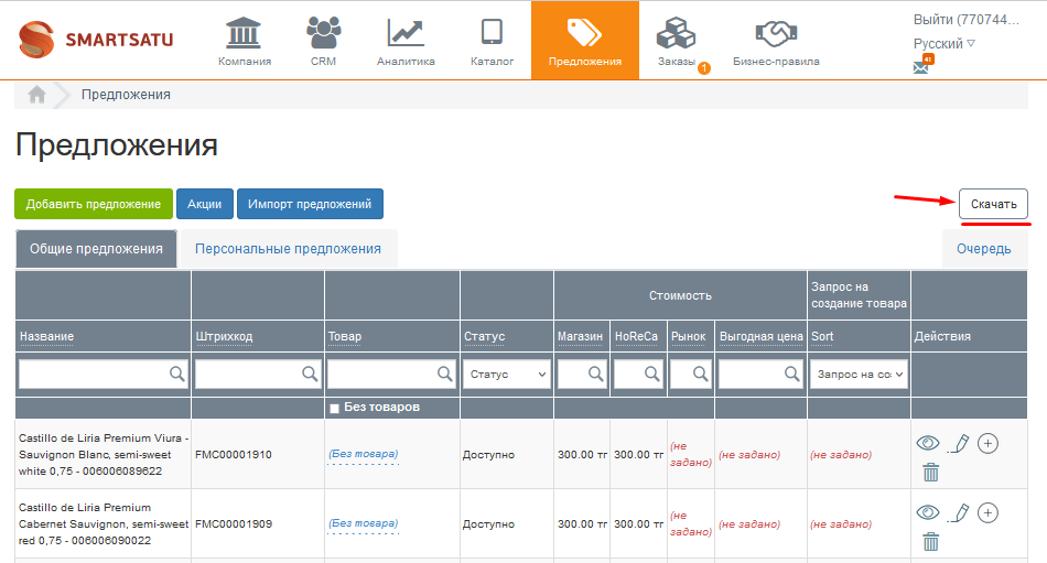 В системе есть возможность импорта .xls-файла с несколькими предложениями. Для того чтобы выполнить импорт предложений, необходимо нажать на кнопку "Импорт предложений".
